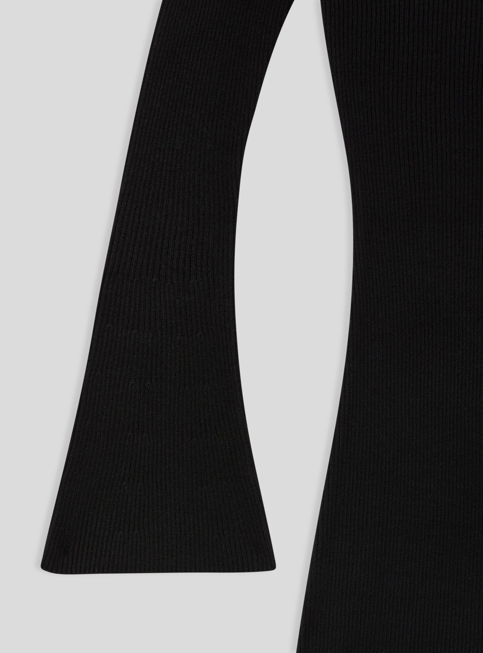 - Short women's dress with a rolled chiffon neckline, leaving the shoulders bare, and slightly flared long sleeves.