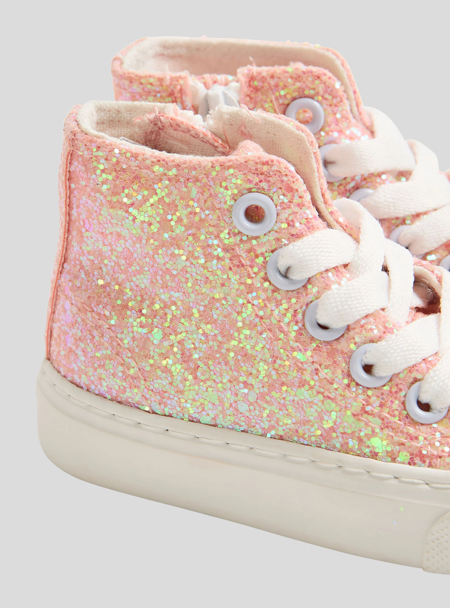 - High-top sneakers for girls, made of pink glitter fabric, are perfect for adding a touch of sparkle to everyday looks.