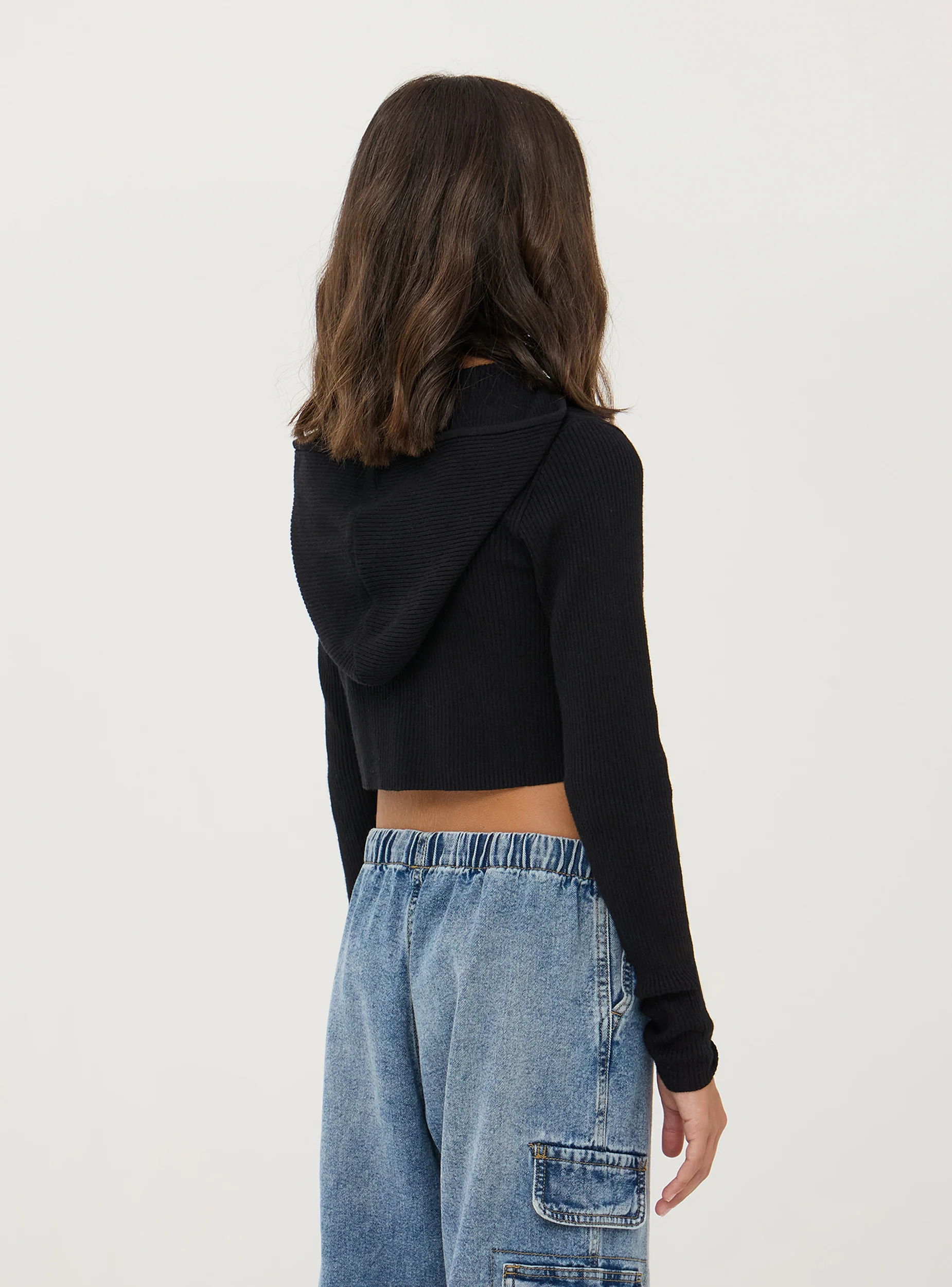 - Girl's cardigan with a hood and zip closure, made of solid ribbed fabric.
