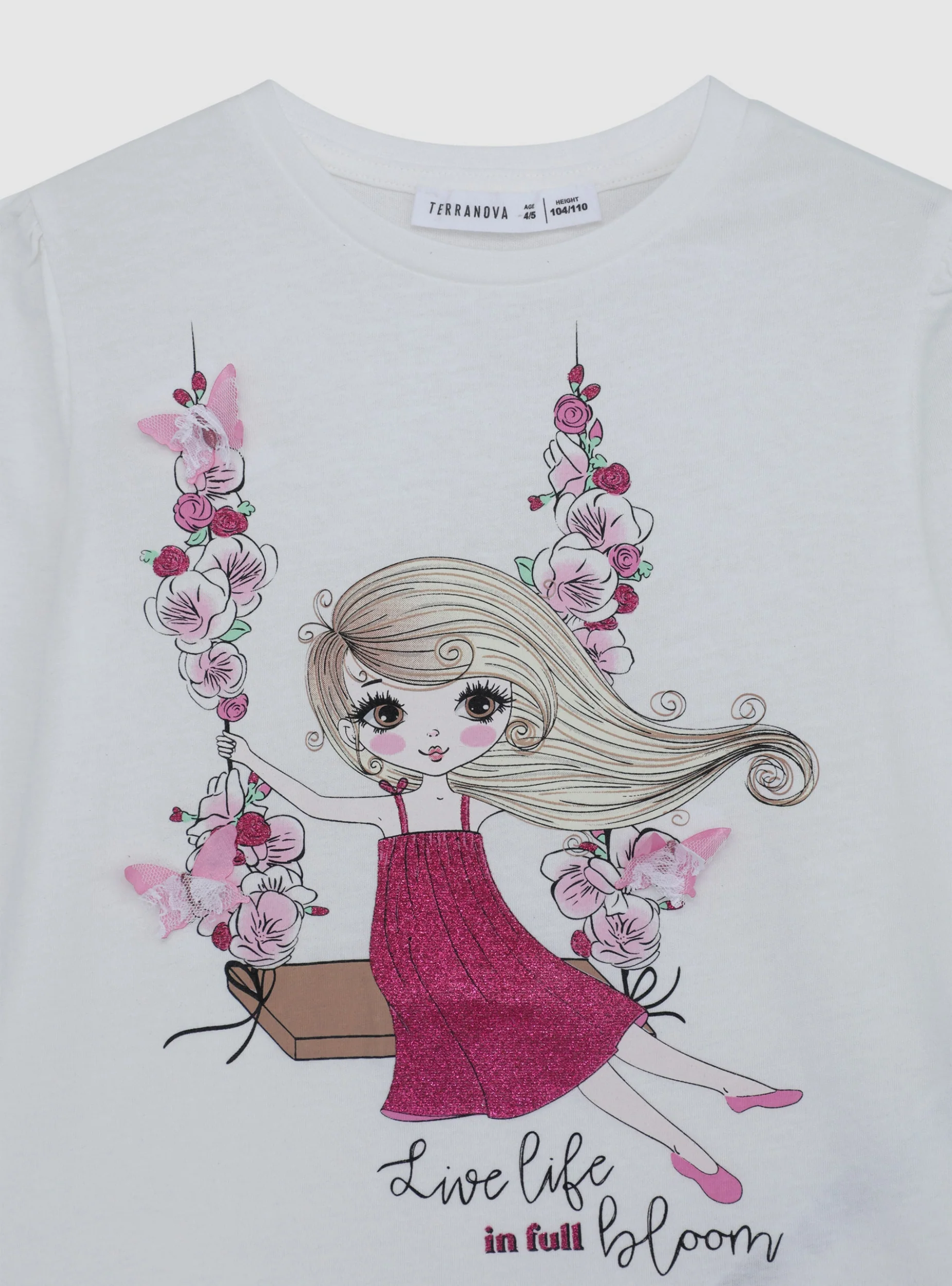 - Long-sleeved girls' top with a round neckline, featuring a print of a sweet doll, embellished with sparkling glitter that adds a touch of brightness.