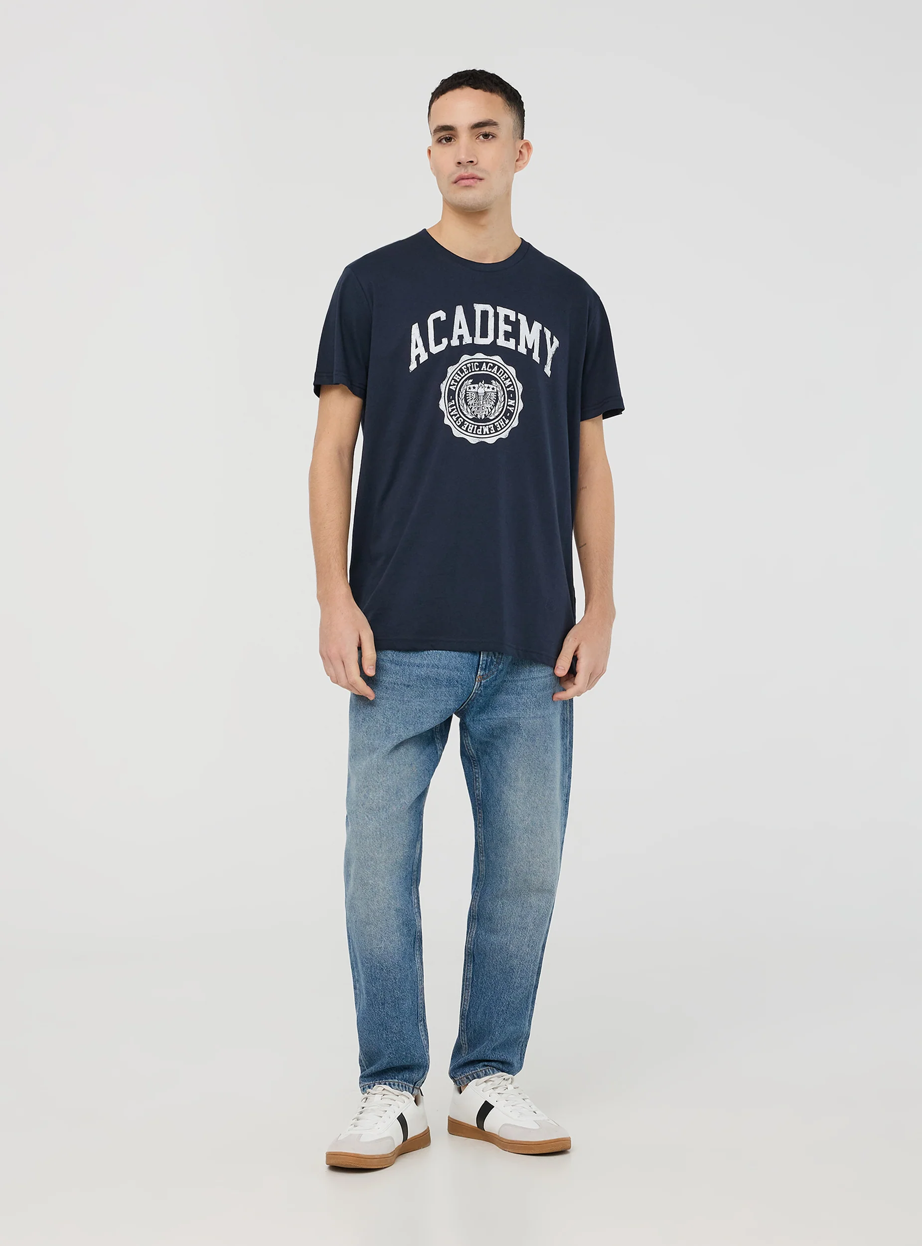 - Featuring an American college-style print that evokes a youthful and dynamic look.