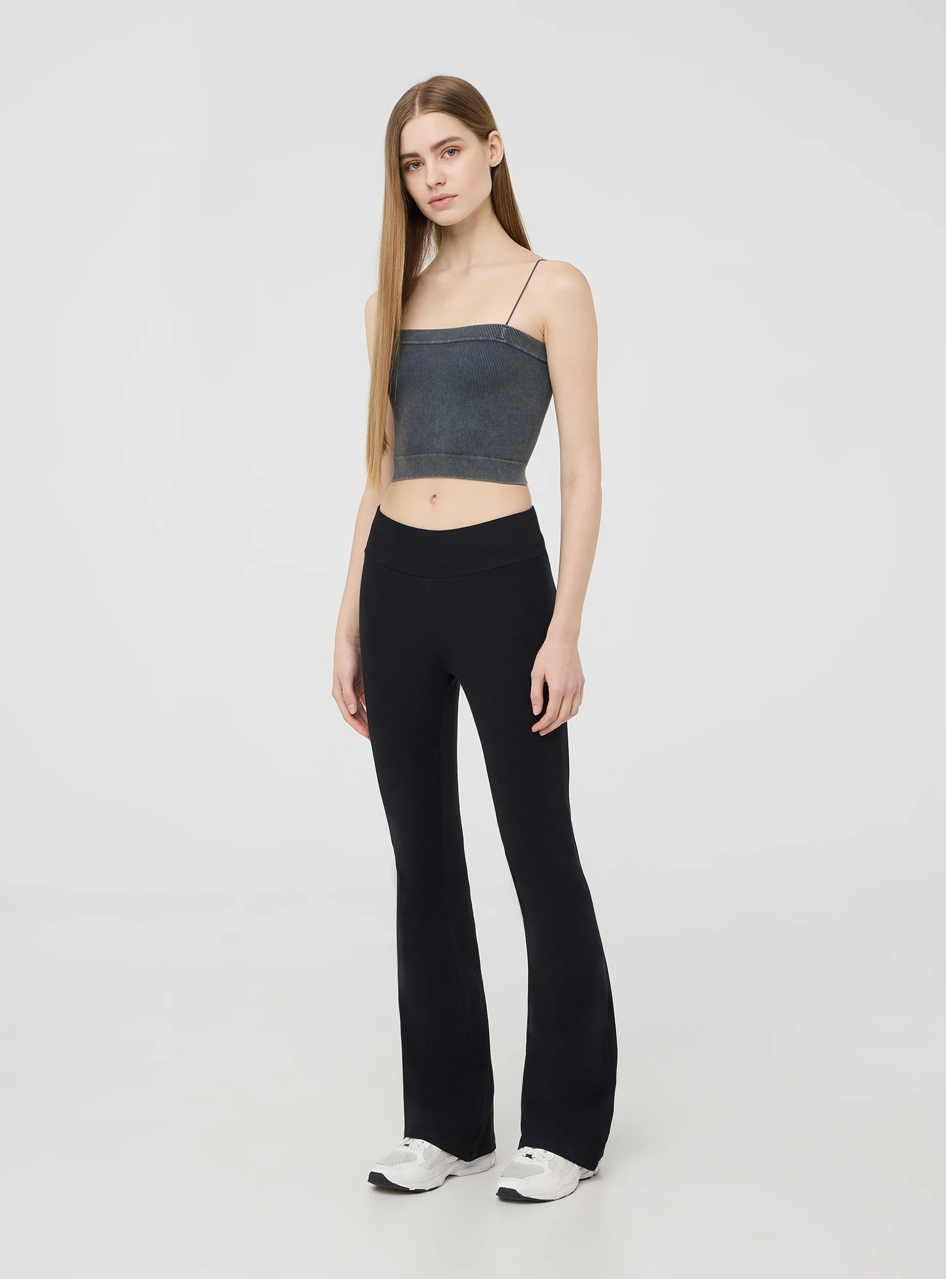 - Women's leggings with a versatile and contemporary style, characterised by a length that elongates the figure and a flared line that adds a trendy touch.