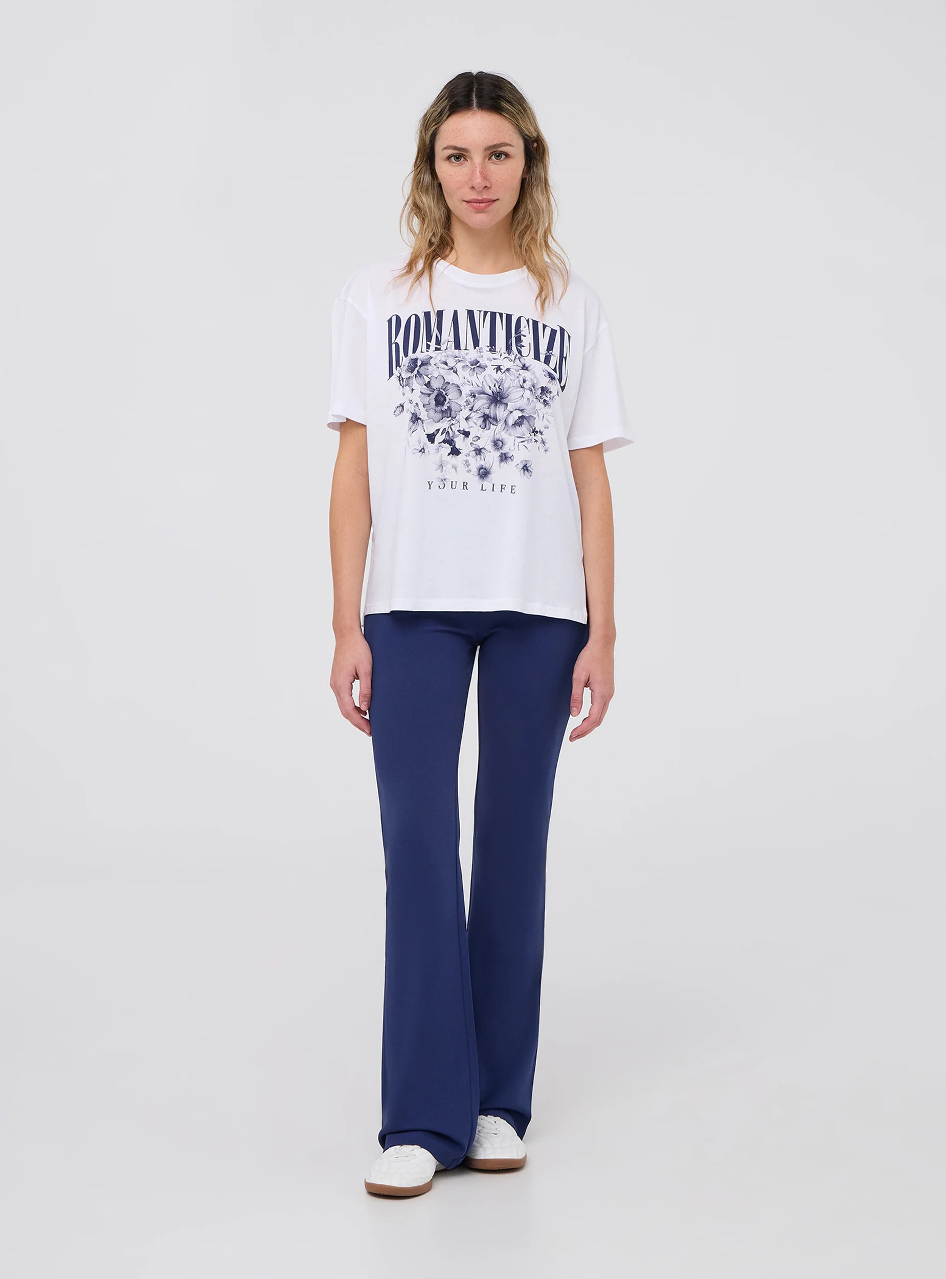 - The front is decorated with a refined floral print accompanied by a central slogan that captures attention, giving a romantic and contemporary touch to the overall look.