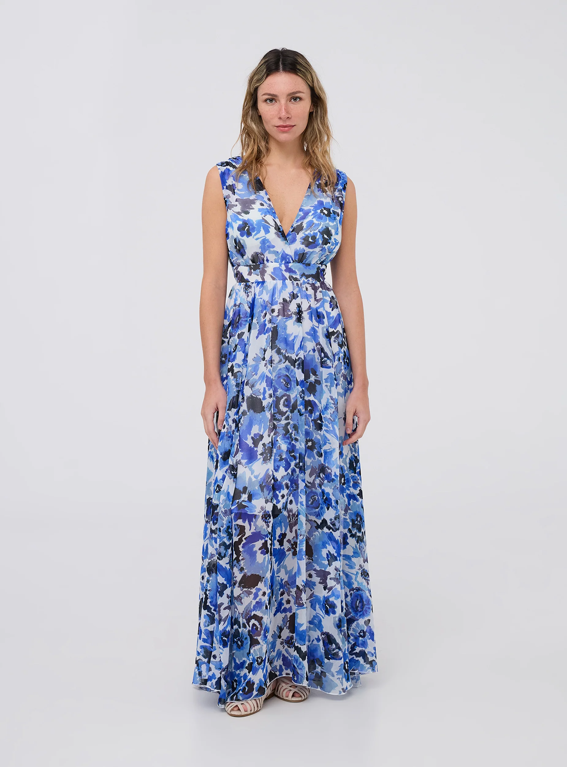 - Long women's dress with a vibrant floral pattern, designed for an elegant and sophisticated look.